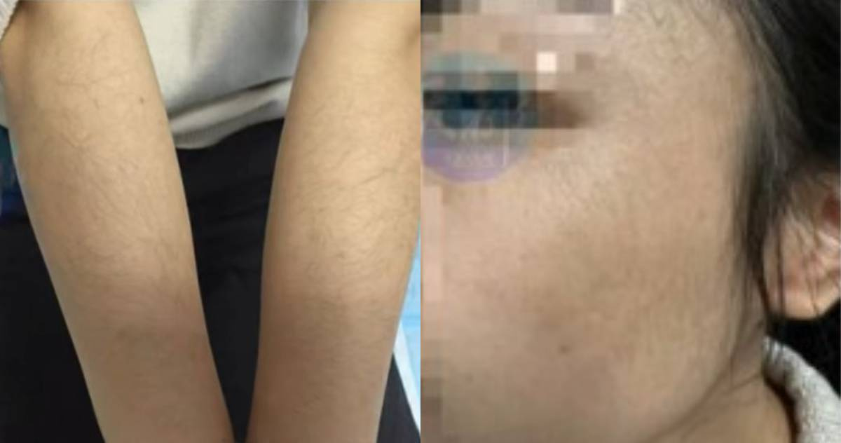 大陸浙江一名女子因為頭髮稀疏,過量使用生髮液,導致額頭、臉頰、唇周以及手臂上的汗毛都長了出來。(圖/抖音)